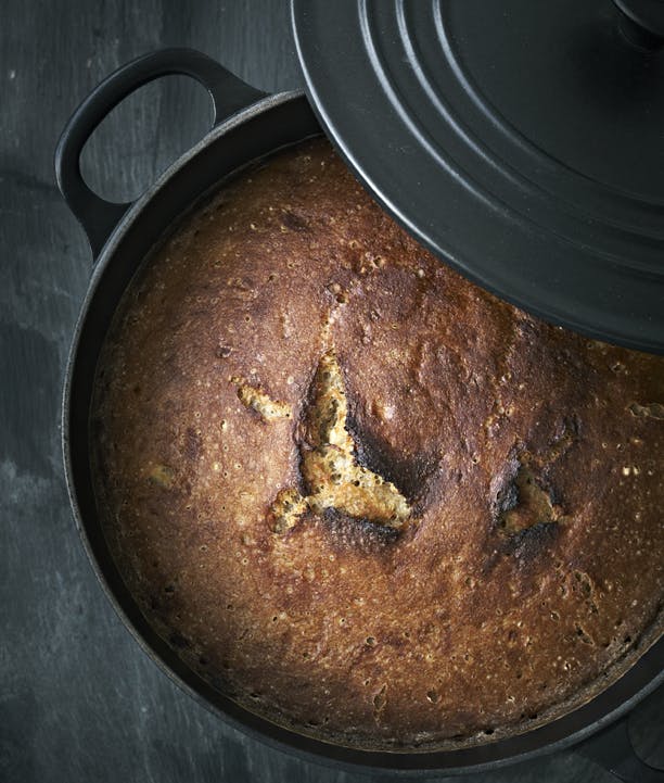 Dag 2: Tag dejen ud af køleskabet, og lad den stå 1 time på køkkenbordet, så den får stuetemperatur. Stil en lille støbejernsgryde (diam. 24-26 cm) i ovnen, og varm op til 230°. Lad gryden stå i 15-20 min. så den er helt gennemvarm. Tag gryden ud, drys lidt mel i, og hæld forsigtigt dejen direkte ned i den varme gryde. Læg låget på, og sæt gryden tilbage i ovnen. Bag brødet i 18-20 min., tag herefter låget af, og bag i yderligere 10 min. så brødet får en flot gylden og sprød overflade. Tag gryden ud, vend brødet ud på en rist, og lad det køle af inden det serveres.