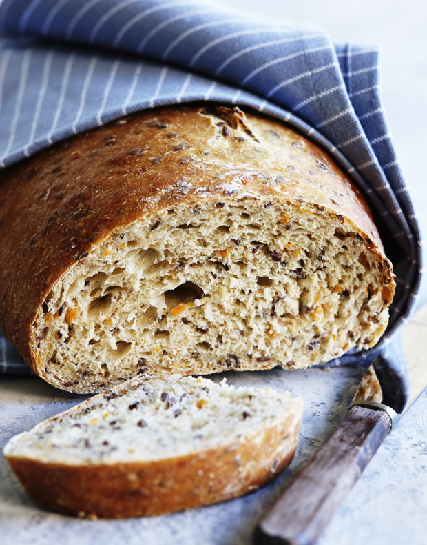 Bag et lækkert speltbrød fyldt med revet gulerod og sunde hørfrøkerner. Spis det lunt med smør, syltetøj eller god ost.