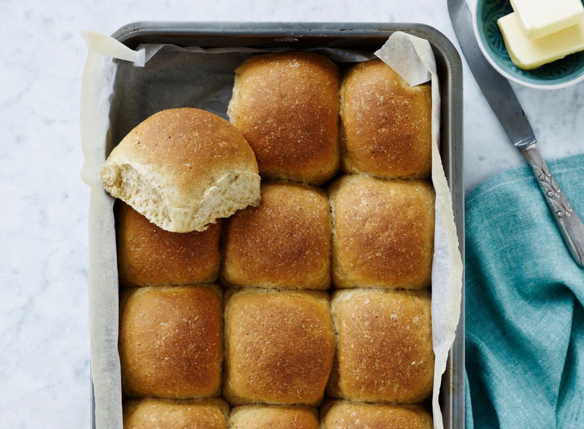 8. Bag hvederne i en 225° varm ovn i 15-20 minutter, til de er lysebrune. Lad dem afkøle i fadet. Bryd forsigtigt bollerne fra hinanden, flæk dem, og rist dem på skærefladen på brødristeren eller under ovnens grill.