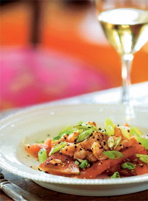 Skær fisken i små terninger og lad dem marinere i citron- eller limesaft i ca. 5 min. til det skifter farve. Hæld det op i en sigte og lad saften dryppe fra fisken. Fjern skallen fra vandmelonen og skær kødet i tynde trekanter. Fordel stykkerne på fire tallerkener eller et stort fad med de marinerede laksestykker ovenpå. Skær forårsløgene i tynde skrå skiver og drys dem ovenpå. Dryp anretningerne med balsamicoeddike. Rist sesamfrøene kort på en pande og drys dem over retten. Smag til med salt og peber før servering.