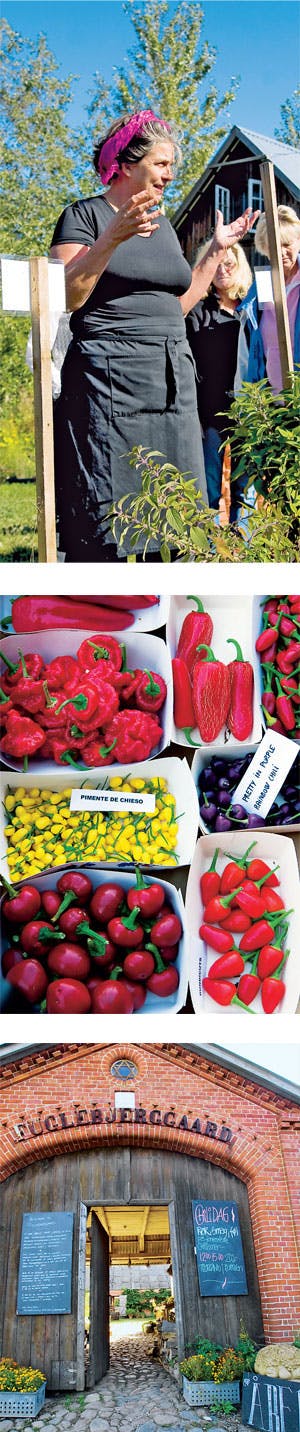 På et træbord i den modsatte ende af rummet ligger gårdens chili-repertoire i små bakker klar til prøvesmagning. Især de gule citronchilier er opsigtsvækkende. De starter med sødme, så opleves citron, og det hele ender med modne frugtnoter. Små, runde og hidsige Pimente de Chieso er yndige og pokkers stærke. Røde og grønne jalapeños, som er de mest populære chilier på verdensplan, skuffer heller ikke. Spørgsmålene ryger gennem landluften og besvares med entusiasme og humor. Og humøret bliver endnu højere, da der uddeles smagsprøver på retterne. Camilla takker af, mens gæsterne iler over i den bugnende gårdbutik og investerer i deres yndlingschiliplante eller chilier i løs vægt.