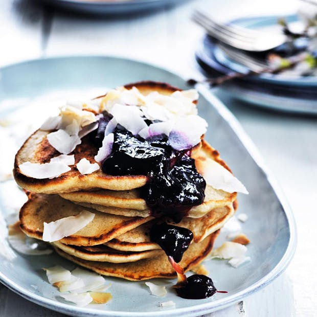 Få opskriften på disse lækre og luftige amerikanske pandekager med banan og kokosflager, som både er et hit på brunchbordet eller en favorit i ulvetimen!