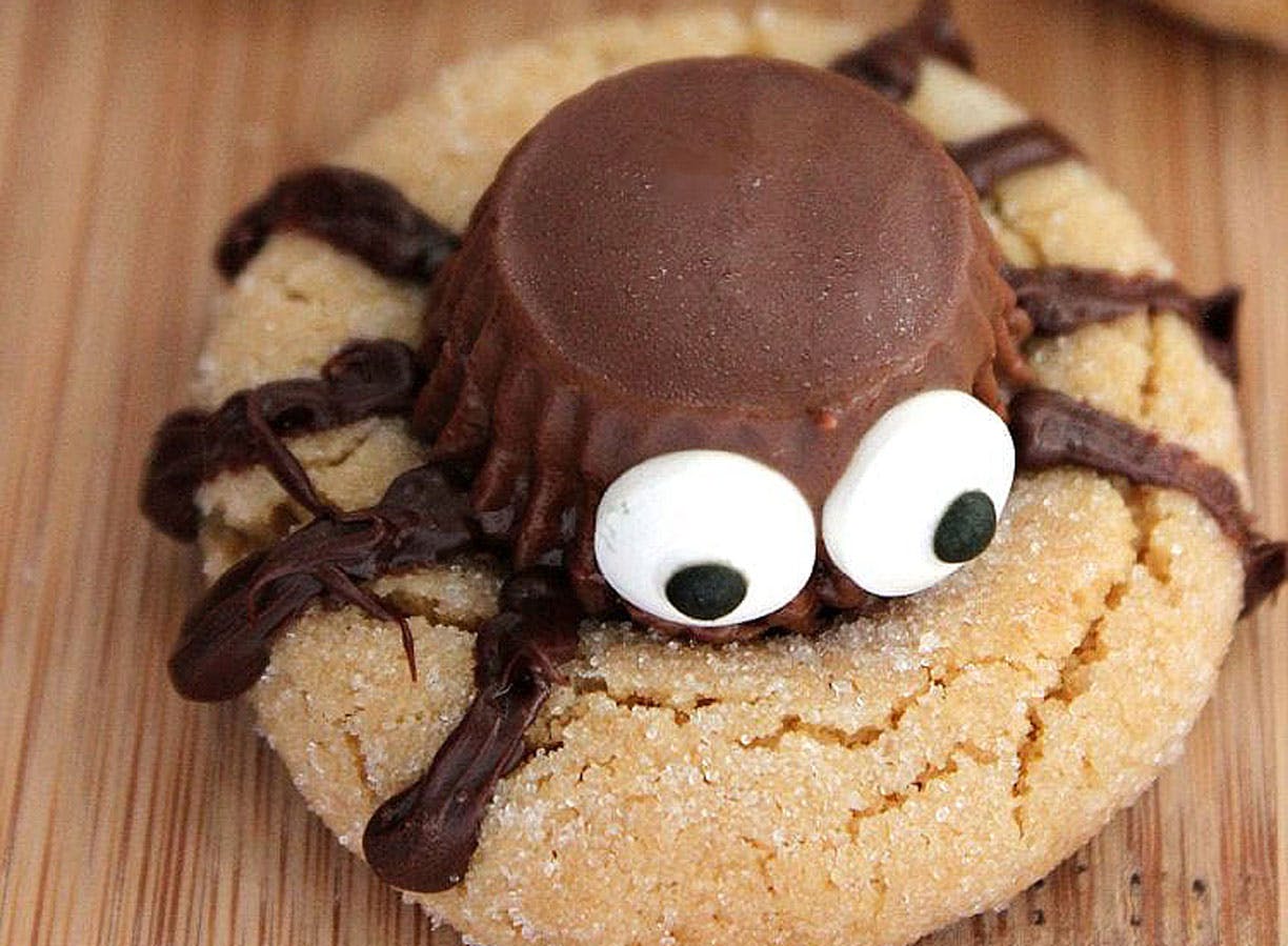 Kom en Reese's eller et andet stykke chokolade på toppen af en småkage, og tegn derefter edderkoppe-ben og ansigt på.