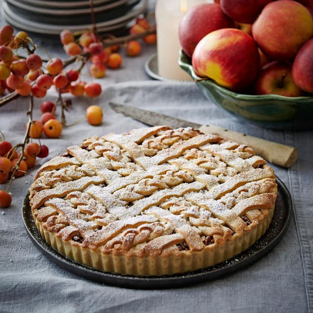 Brug de sidste gemmeæbler i en dejlig æbletærte med marcipan, pekannødder og chaikrydderier. Vi guider dig til, hvordan du dekorerer den med et smukt fletlåg.