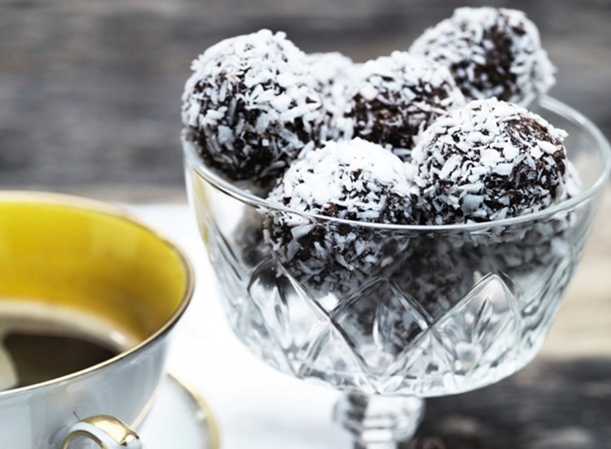 2. Pynt: Tril kuglerne i kokosmel, og opbevar dem på køl.