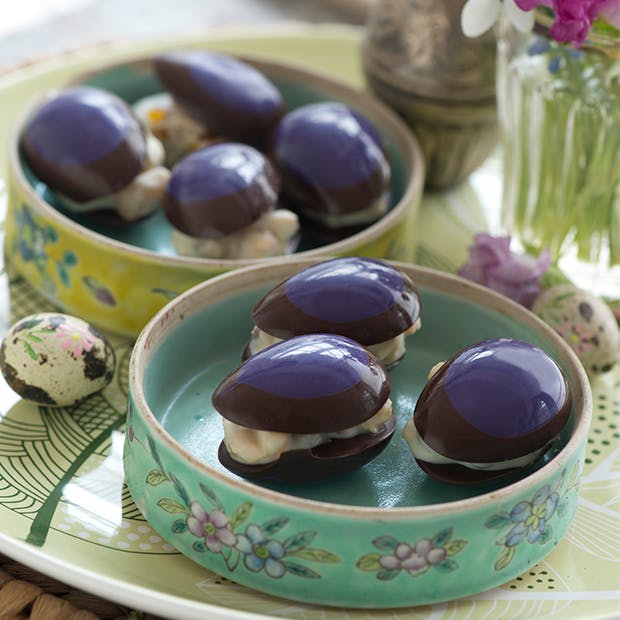Imponér gæsterne med flotte, hjemmelavede chokoladeæg til påskefrokosten. Her får du en opskrift på yndige og velsmagende påskeæg med abrikos og lilla chokolade.