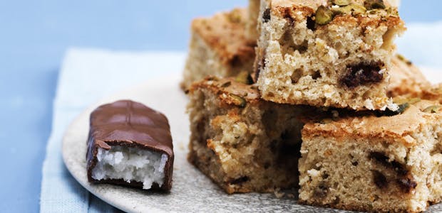 Hvorfor vælge mellem chokoladebar og et stykke kage, når du faktisk kan få begge dele på én gang? I denne dobbeltsyndige Bountykage med pistacienødder kombinerer vi Bounty med lys brownie, og det er altså noget af et hit!