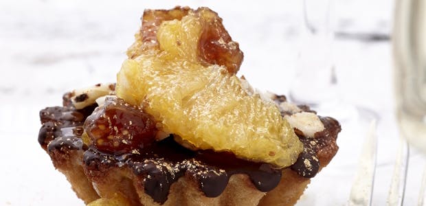 Lav små fine marcipantærter, og væk lykke omkring kagebordet. Vi har opgraderet kagen med syltede appelsiner og figner.