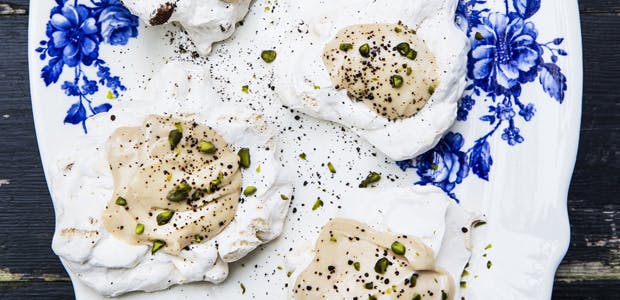Marengs med lemoncurd og lakrids er en forårsfrisk dessert med smag af citron, lakrids og solskin.
