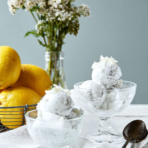Citronsorbet er altid et hit! Den hvide is med de blå birkes sender tankerne mod dragefrugt, og det giver sammen med den syrlige citronsmag mundvandet løb.