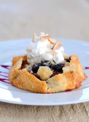 Fyld og bund: Befri æblerne for stilk, blomst og kernehus og skær dem i både (5-6 pr. portionsform). Skær mørdejen i kvadrater, der passer til formene. Pensl formene med smør. Beklæd dem med dej. Fordel mandelcremen på dejen, derpå æblebåde og blåbær. Fold hjørnerne af dejen let hen over kagerne. Pensl dejkanten og folderne med æggeblomme, -hvide el. sammenpisket æg.