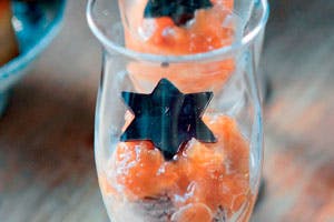Smelt chokoladen i vandbad. Det skal være ca. 45°. Pisk fløden let og rør den i chokoladen. Læg et par knuste makroner i bunden af hvert glas og stænk med fx marsala. Læg chokoladecremen i og efterfølgende æblekompotten. Pynt evt. med chokoladespåner eller anden hjemmelavet chokoladepynt.