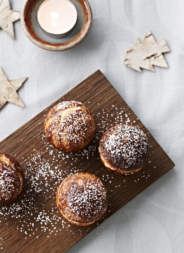 Æbleskiver med løg og bacon er en af Thomas Hermans signaturkreationer og vil med garanti blive en succes på julebordet. Få flere gode tips og juleopskrifter af Thomas Herman i galleriet nedenfor. Opskriften giver dig snacks til 6 personer.