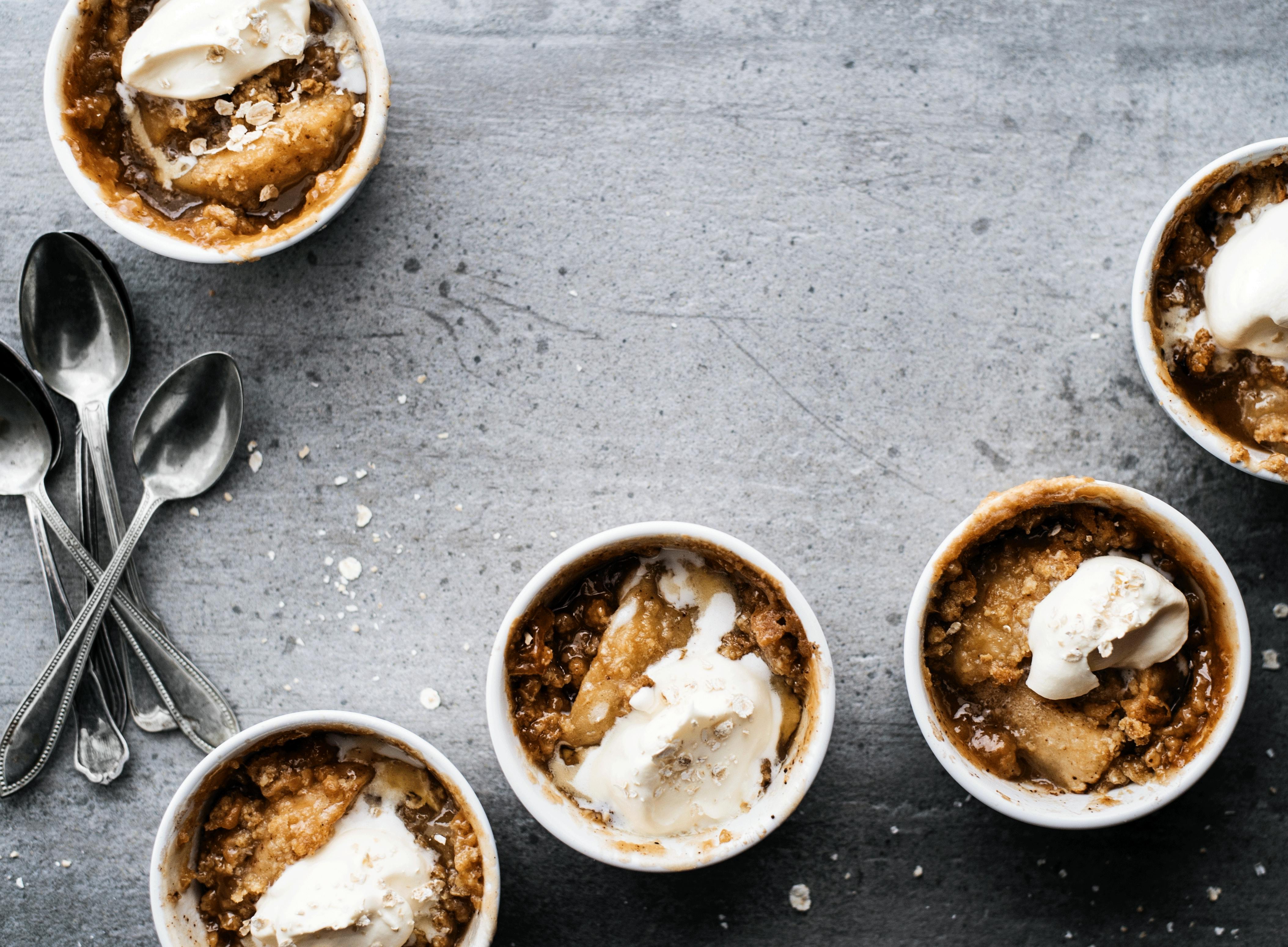 Den her opskrift byder på små æbletærter, som du kan servere for dine gæster. Smuldredejen og karamelsaucen bliver blandet i en lille porcelænsskål, en ramekin, der kan tåle en tur i ovnen.