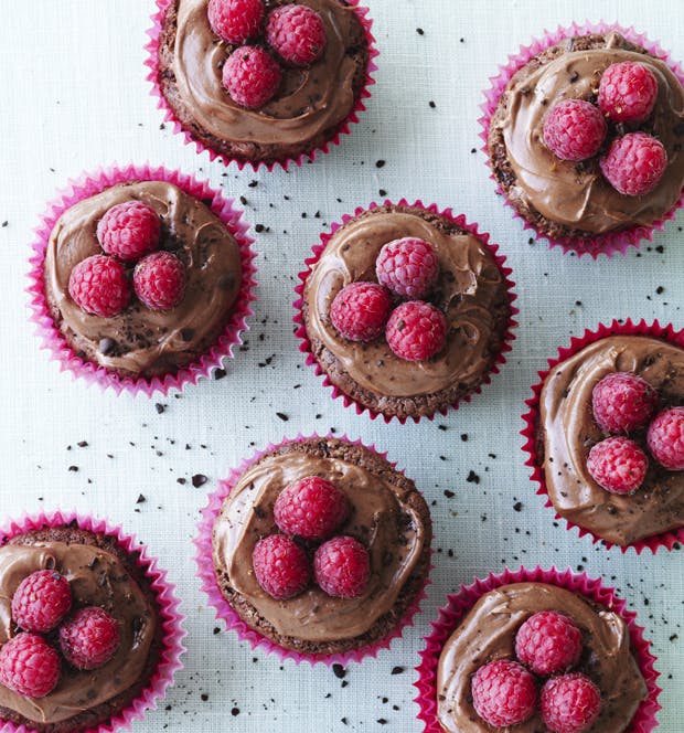 Pynt: Fordel hindbærrene på kagerne, drys med knuste espressobønner, og server.