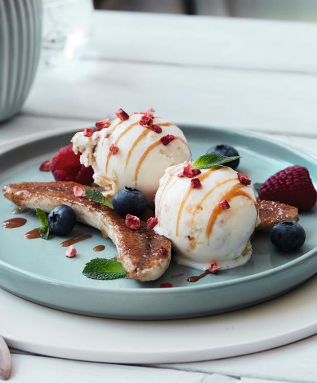 Vi har givet den lækre isdessert et moderne tvist med karamelliserede bananer og is af cheesecake-og passionsfrugtis. Top med søde bær fra haven, og du har den skønneste sommerdessert.