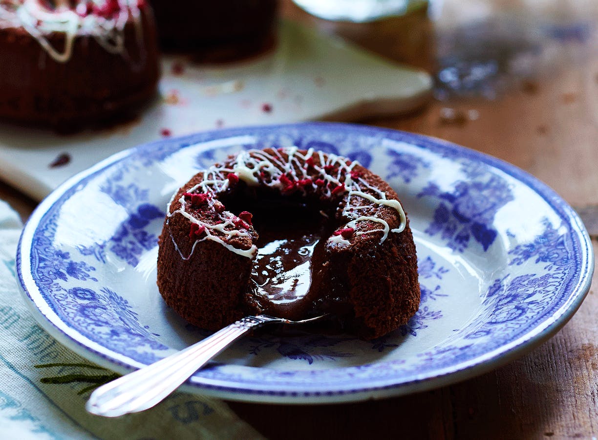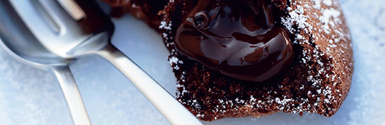 Molleux au chocolat er det oprindelige navn på denne chokoladekage med en blødende midte. Molleux betyder blød på fransk, og kagerne skal netop være bløde i midten, så du må endelig ikke gennembage dem. En blødende chokoladekage er en klassiker på dessertkortet, da den smager fremragende, og det er altid spændende at se chokoladen flyde ud, når skeen borer ned i kagen.