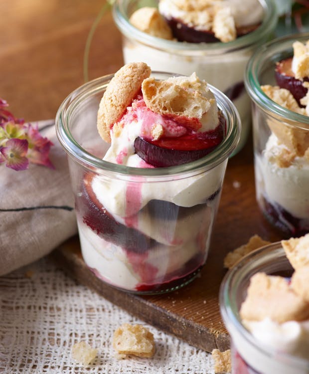 Sæsonens frugt, fløjlsblød vaniljecreme og knasende makroner. Denne skønne treenighed tiltaler de fleste, og i opskriften har blommetriflien fået lidt kant med en smule sherry.