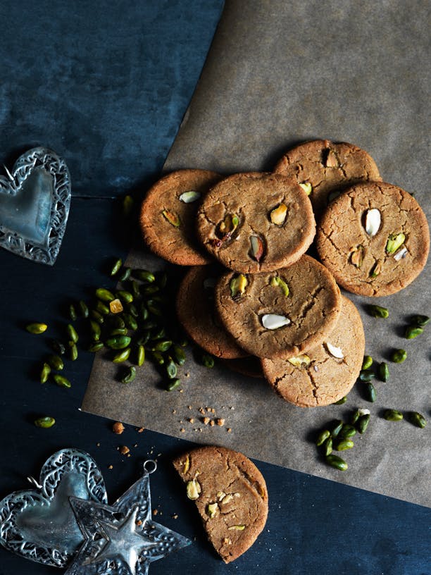 Rør sukker, smør og sirup sammen i en foodprocessor. Bland krydderierne, natron og mel sammen, og ælt det krydrede mel i smørblandingen. Hak mandler og pistacienødder, og bland dem i dejen. Tilsæt yderligere mel hvis nødvendigt.