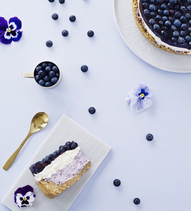 Vi er vilde med den her opskrift på blåbær-cheesecake, fordi de fine lag tager sig flot ud, når du skærer af kagen, og cheesecaken emmer af sommerstemning. Skær den med en lun kniv hele vejen rundt langs med kanten, inden du løsner springformen, så er den nemmere at få af, og kanten står ekstra skarpt. Prøv også: Cheesecake der IKKE skal bages