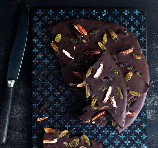 Hak chokoladen fint, og smelt den over et vandbad. Med den mørke chokolade kan du godt smelte det hele med det samme. Hæld den smeltede chokolade ud på et stykke bagepapir, og form med en paletkniv til den ønskede form og tykkelse. Hak pekannødderne groft, og fordel dem i chokoladen. Tilsæt syltet ingefær, og til sidst rosinerne. Stil chokoladen i køleskabet, indtil den har sat sig.