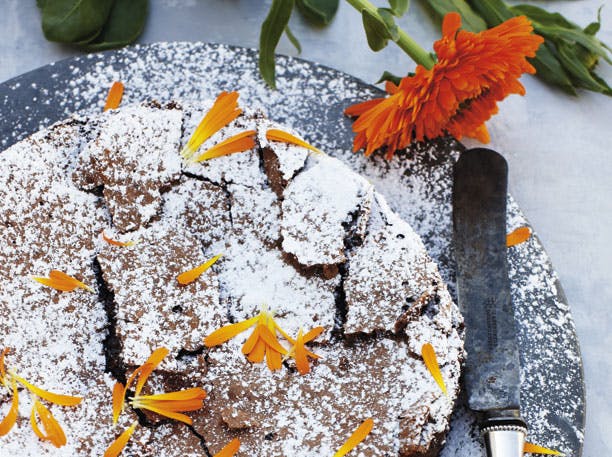 Løsn kanten af kagen med en kniv før formen åbnes. Opbevar kagen på køl, og tag den ud 30 min., før den skal spises, så den har stuetemperatur ved servering. Drys kagen med florsukker, og pynt evt. med kronblade fra morgenfruer.