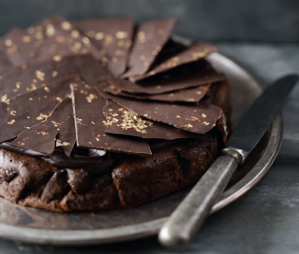 Servér denne intense chokoladekage som dessert til årets påskefrokost - den bliver uden tvivl årets store påskehit. Kagen er smurt med chokoladecreme og pyntet med tynde chokoladeplader og guldstøv, og den vil uden tvivl gå i enhver chokoladeelskers hjerte.