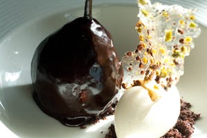 Chokoladecrumble: Bland smør, mel, sukker og kakao til en smuldredej. Læg smulderet på en smurt bageplade og bag det ved 120° i 35-40 min. til det er sprødt. Server pæren med en kugle vaniljeis på en bund af chokoladecrumble. Pynt med hakkede, ristede pistancenødder og evt. en sprød kiks eller vaffel.