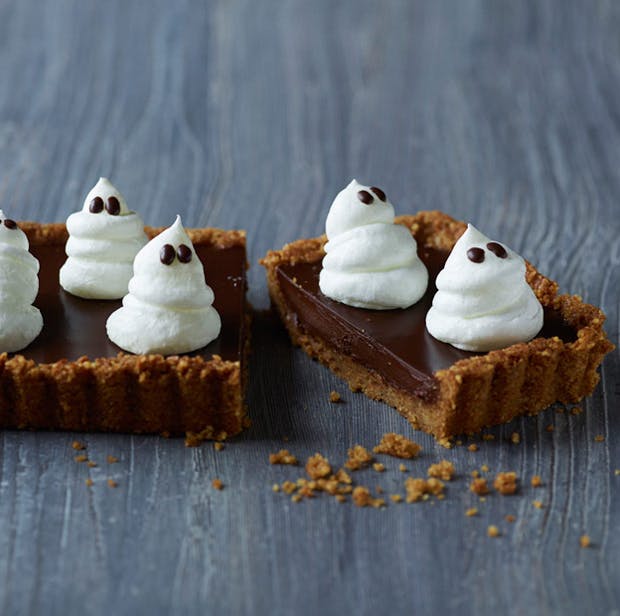 Server en cremet chokoladetærte med små hvide sukker-spøgelser, når halloween står for døren. Denne chokoladetærte hører til i det sødeste slaraffenland, man kan forestille sig, og både børn og voksne vil fortrylles, når de sætter tænderne i den skønne chokoladetærte med marcipan.