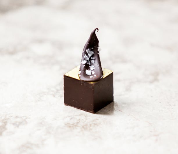 Tip! Pynt chokoladen med en 'chokoladefinger': Dyp en ren finger i tempereret mørk chokolade, og lav et 'fingeraftryk' på et stykke buet bagepapir, og lad chokoladen stivne. Drys evt. med lidt havsalt.
