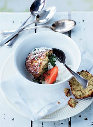 Riv citronskallen fint. Rør citronskal med ricotta og florsukker. Tilsæt kornene fra en vaniljestang. Hak citronmelissen fint. Server kagerne med jordbær skåret i halve, ricottacreme og drys af friskhakket citronmelisse.