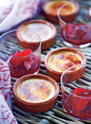 Skyl blommerne. Skær dem i mindre stykker og fjern stenen. Læg blommestykker i en gryde sammen med et stykke hel ingefær og rørsukker. Flæk vaniljestangen, skrab kornene ud og tilsæt vaniljen i gryden sammen med vaniljestangen og kanel. Tilsæt vand og læg låg på gryden. Kog det hele sammen under svag varme i ca. 30-40 min. til blommerne har konsistens som en kompot. Fjern ingefær og kanel- og vaniljestang og server blommekompotten til crema catalana.