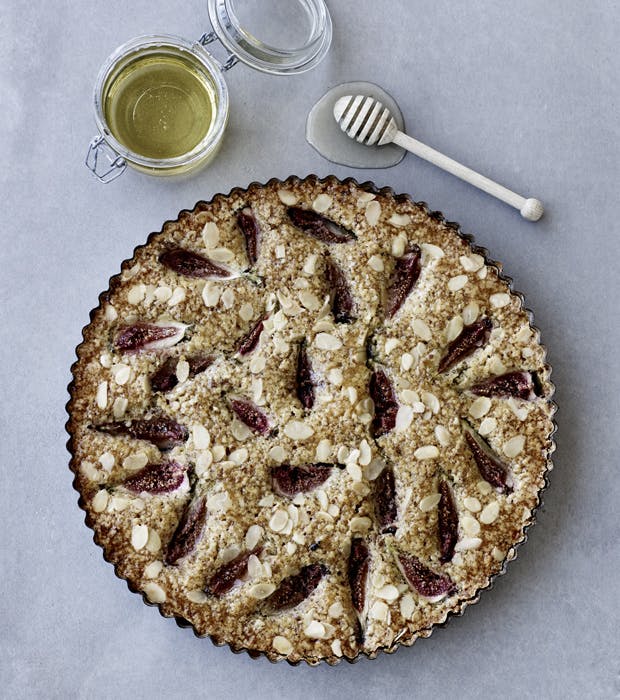 Vi er meget begejstrede for den her figentærte, fordi den er fyldt med spændende smagsindtryk, der spiller perfekt sammen. Tærtebunden er bagt med en kombination af mandel- og hvedemel. Mandlerne giver en god sødme til den friske syrlighed fra figner og citron- og appelsinskal.