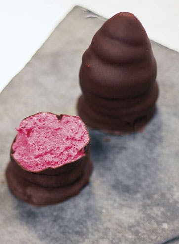 Køl bundene af og sprøjt rødebedemarengsen på med en sprøjtepose. Stil dine flødeboller på køl igen.