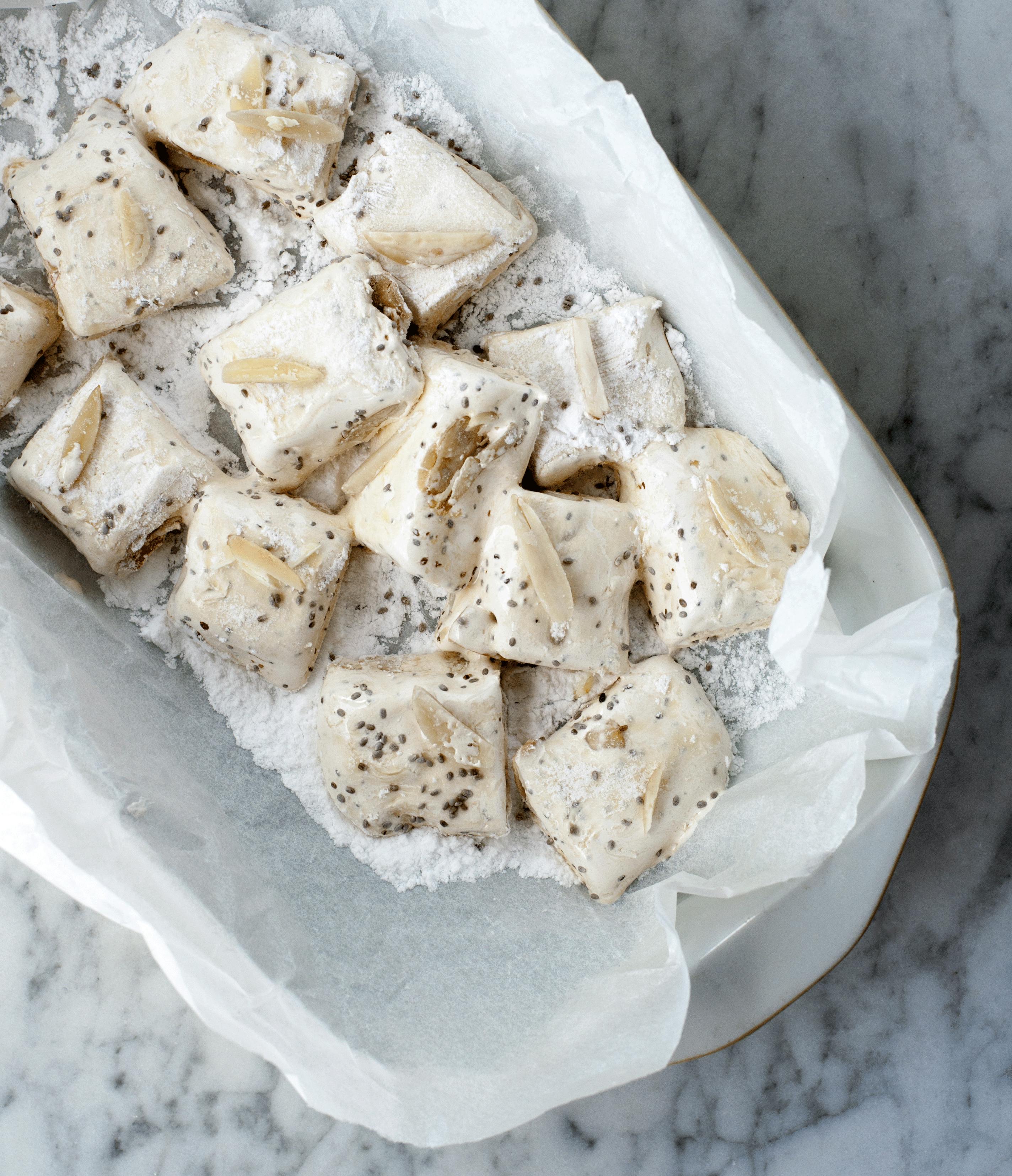 I opskriften her har vi skiftet pistacienødderne ud med chiafrø og mandler. De små frø giver en knasende effekt, der klæder en ellers sej fransk nougat, og mandlerne tilfører lidt at tygge i.