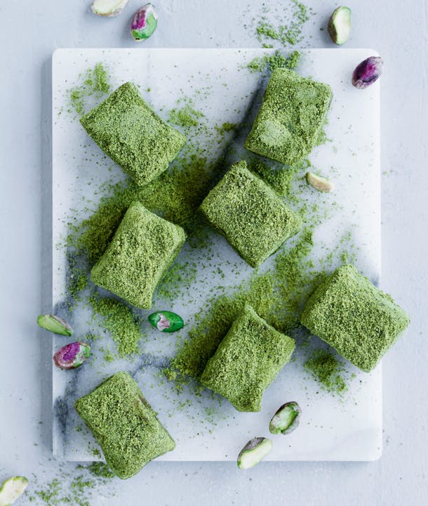 Go green! Hvis du har et blødt punkt for peanutbutter, er denne fudge uden sukker helt uimodståelig. Den er lavet uden raffineret sukker og mælkeprodukter, men er stadig super cremet, sød og lækker. Fudge-stykkerne er rullet i pistaciemel, som giver dem et flot udseende, og så har de en rund smag af tranebær, som gør dem frugtige. De er et delikat og farverigt bud på julekonfekt!