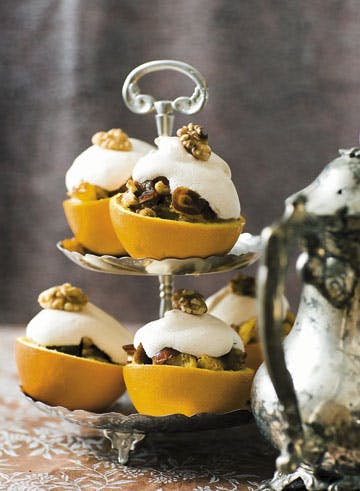 Skær den tørrede frugt i små stykker. Bland frugt, nødder og kanel. Fyld appelsinskallerne med blandingen og dryp lidt cognac over. Pisk æggehviderne til hårdt skum. Tilsæt sukkeret og fortsæt med at piske til blandingen er tyk, sej og blank. Bred marengsblandingen ud over frugten. Bag appelsinerne i midten af ovnen ca. 12-15 minutter, til marengsen har fået lidt farve. Server med det samme.