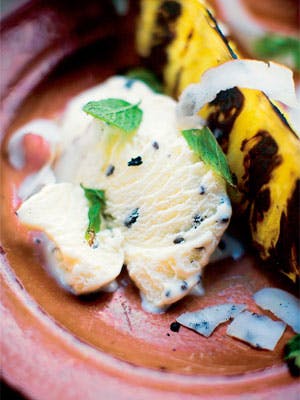 Server de lune grillede ananas med kokosflager, vaniljeis og plukkede mynteblade.
