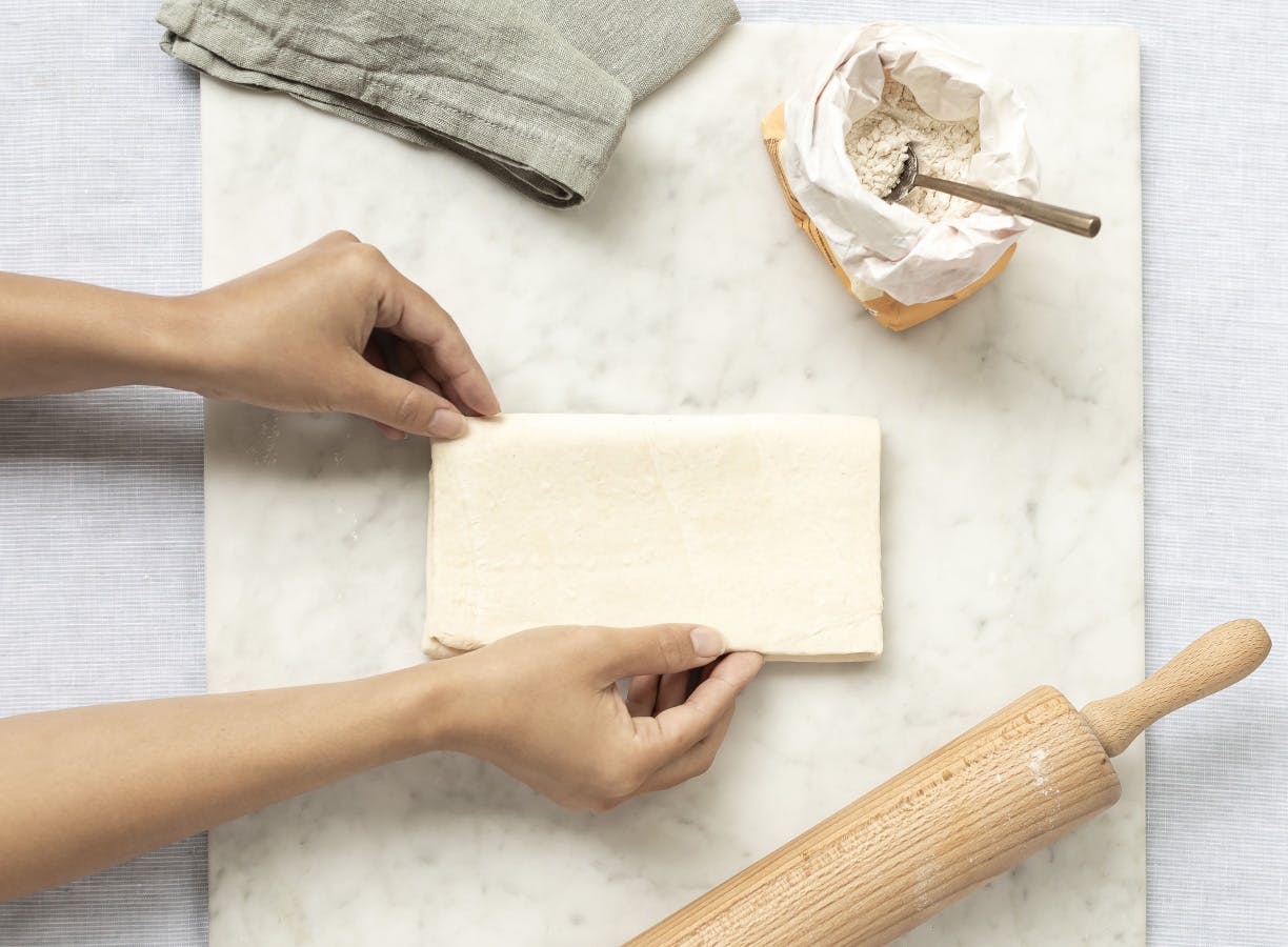 1. Læg koldt smør mellem 2 stykker bagepapir, og rul det ud til en firkant på 10 x 10 cm med en kagerulle. Læg smørret på køl.