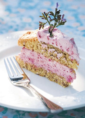 Pynt din hindbærlagkage med de bær, der blev taget fra, og/eller et par af sommerens blomster.