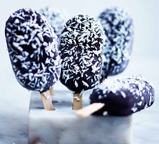 Er du er vild med Bounty, vil du knuselske disse mini-ispinde med cremet kokossorbet og et tykt lag knasende chokolade. Brug blot din yndlingschokolade, når du overtrækker dem. Opskriften er fra bogen "Lykken er is," som gør en akut lækkersulten efter is!