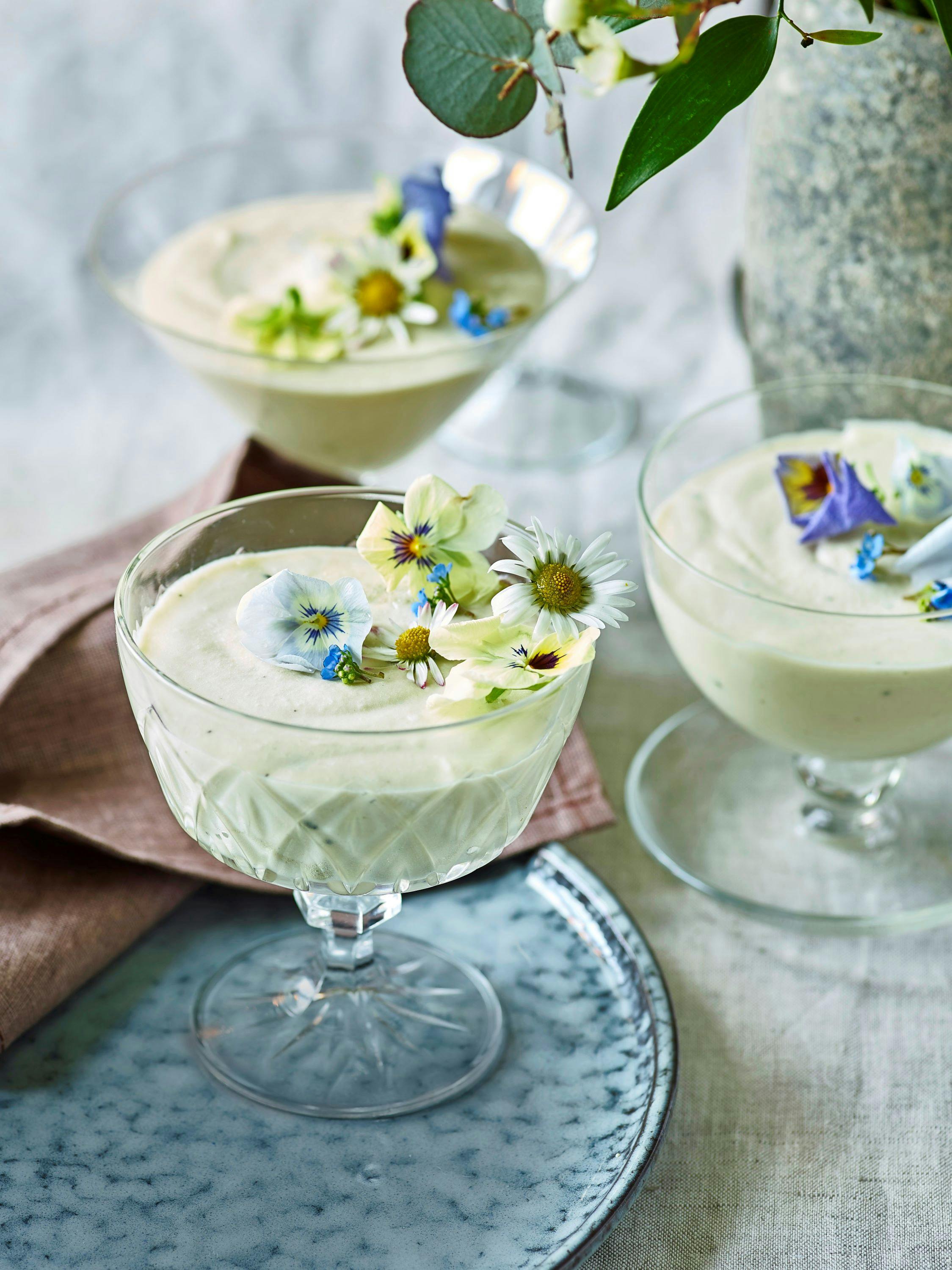 Hvid chokolademousse med matcha-te og spiselige blomster