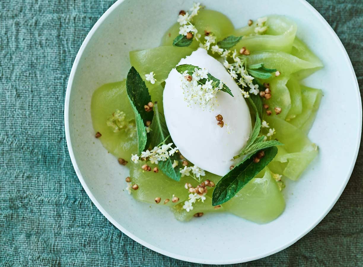 Det skal du bruge for at lave hyldeblomstsorbet med hyldeblomstsyltet melon, mynte og sprød boghvede
