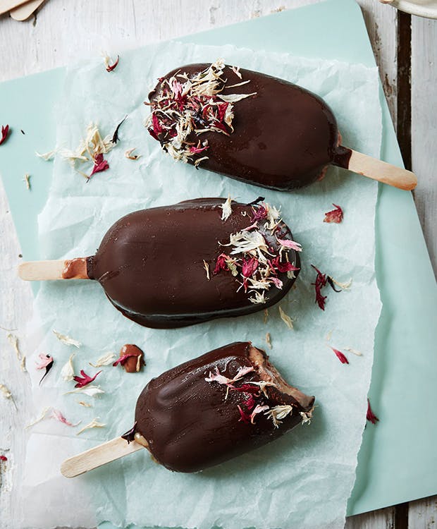 Vi er af den overbevisning, at man bør spise is hver eneste dag – også når det er overskyet. Derfor har vi naturligvis forelsket os i disse ispinde. Med denne opskrift på chokoladeispinde forenes nemlig tre af vores absolut yndlingsting – chokolade, is og saltkaramel. Kombineret smager det fantastisk, og hvis du pynter dem med tørrede spiselige blomster, ligner de også en million. Hvis du ikke lige har spiselige blomster, kan du sagtens pynte dem med andet, fx hakkede nødder eller frysetørrede bær.