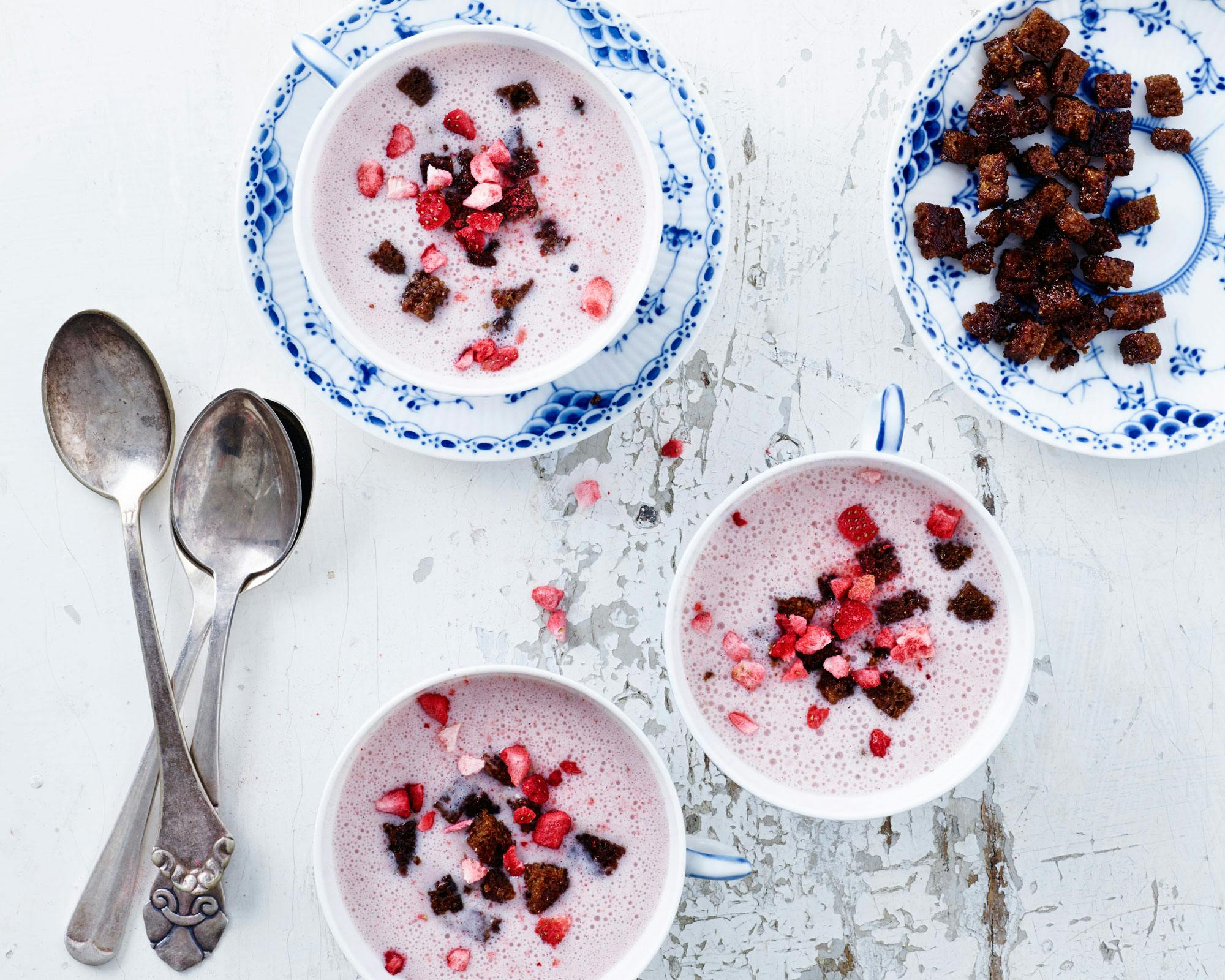 3. Servering: Anret den lyserøde koldskål i 4 portionsskåle eller dybe tallerkener, og top med rugbrøds-croutoner og frysetørrede jordbær. Servér straks!