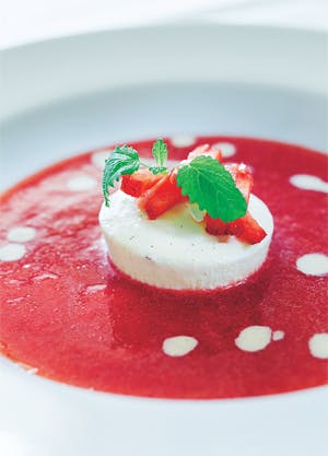 Server jordbærsuppen i en dyb tallerken. Tryk isen ud af formen og placer midt i suppen. Pynt med kvarte jordbær og citronmelisse.