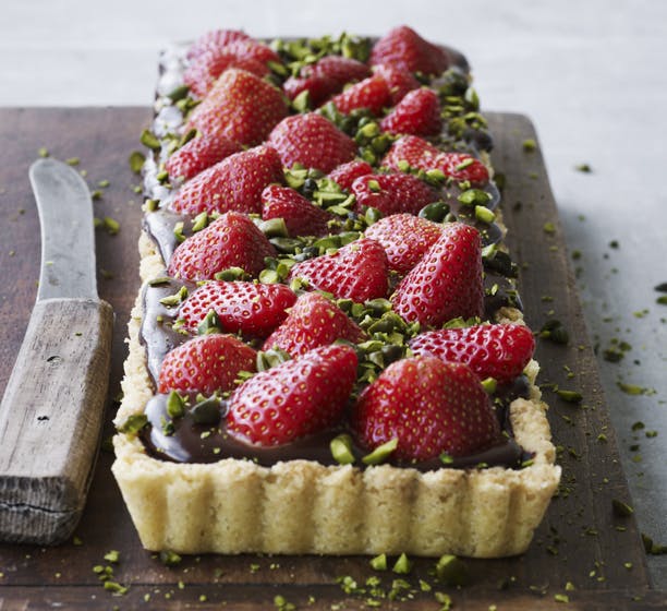 Pluk blomsterne af jordbærrene, og sæt dem forsigtigt i chokolademassen. Drys din jordbærtærte med hakkede pistacier. Sæt den færdige jordbærtærte koldt i mindst 3 timer, gerne natten over.