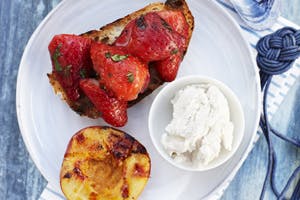 Server en kugle lækker vaniljeis sammen med jordbærtoast og grillet nektarin.