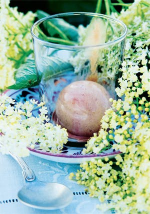 Rens hyldeblomstskærmene og hak dem groft. Hæld dem i en gryde sammen med vand og rørsukker og bring det til kogepunktet. Kog sammen i 5 min. og træk straks gryden fra varmen. Tilsæt citronsaft og kakaopulver. Pisk indtil kakaoen er opløst. Afkøl helt. Sigt væsken igennem en finmasket sigte og frys i en ismaskine.