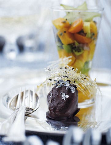 Smelt chokoladen over vandbad. Dyp iskuglerne i chokoladen og pynt med sølvstøv. Læg dem på bagepapir på en plade og sæt dem tilbage i fryseren.